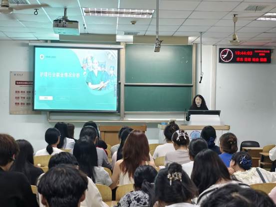宣讲会上,费杨副部长立足医疗卫生行业发展现状,深入分析了护理专业的就业前景与发展机遇,为学子提供了专业指导,强调“夯实专业基础,关注学科前沿”的重要性。此外,她还鼓励学生要有充分的计划,做有准备的人。